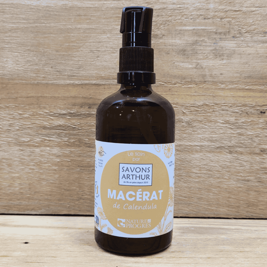 Un macérat huileux à l'huile de tournesol bio (pressée à la savonnerie) et à la fleur de calendula bio.