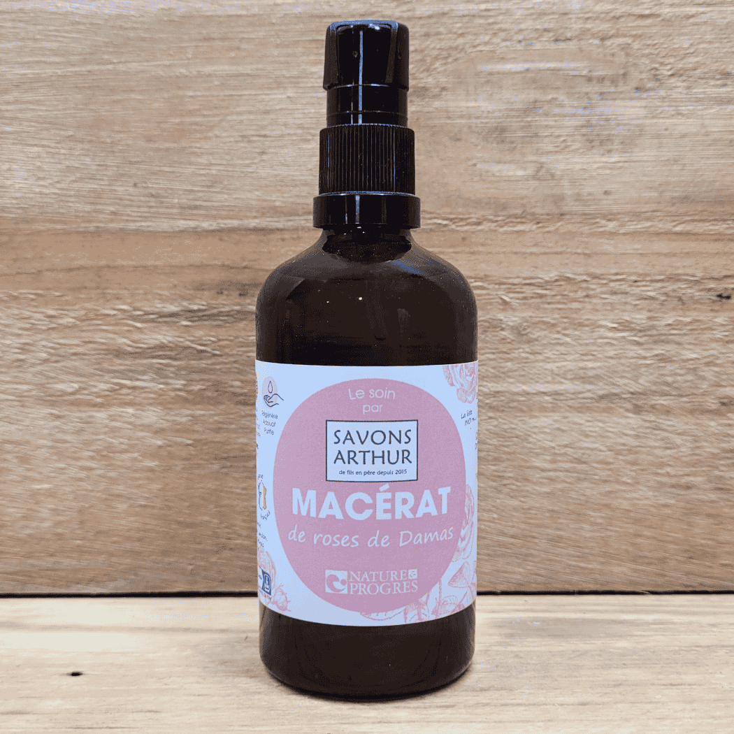 Un macérat huileux à l'huile de tournesol bio (pressée à la savonnerie) et à la rose de Damas bio.